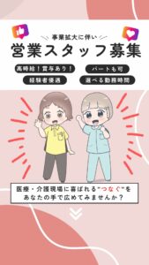 つなぐを一緒に広める仲間を募集します! 2026年2月23日 事業拡大に伴い、医療介護マッチングつなぐを一緒に広める仲間(営業)を募集します。 詳細は、以下のURLからご確認ください。ご応募お待ちしております! 求人詳細はこちらをクリック